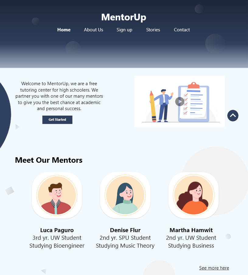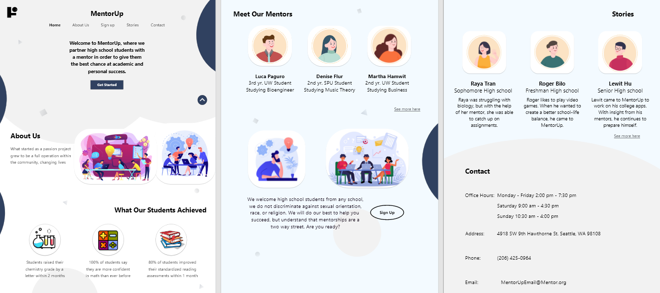 I created MentorUp as a way for high schoolers to connect with college students for tutoring and mentorship. Since they are only a few years older they are more relatable and have the foresight to understand the next steps to take to improve these high schooler’s academics and be prepared for college.