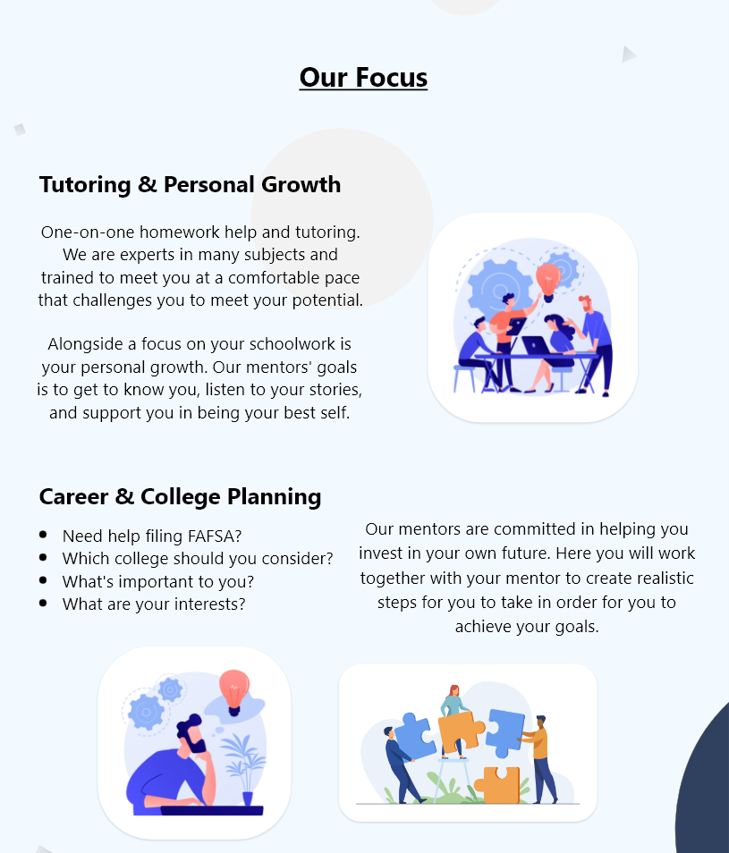 I performed a competitive audit for 3 websites, 2 for student tutoring programs, and 1 for mentors connecting with tech workers. I took a close look at each website to see what they did well, how they presented themselves, analyzed the sign-up process for ease of use and constraints, services they offered, and the overall use of the website.